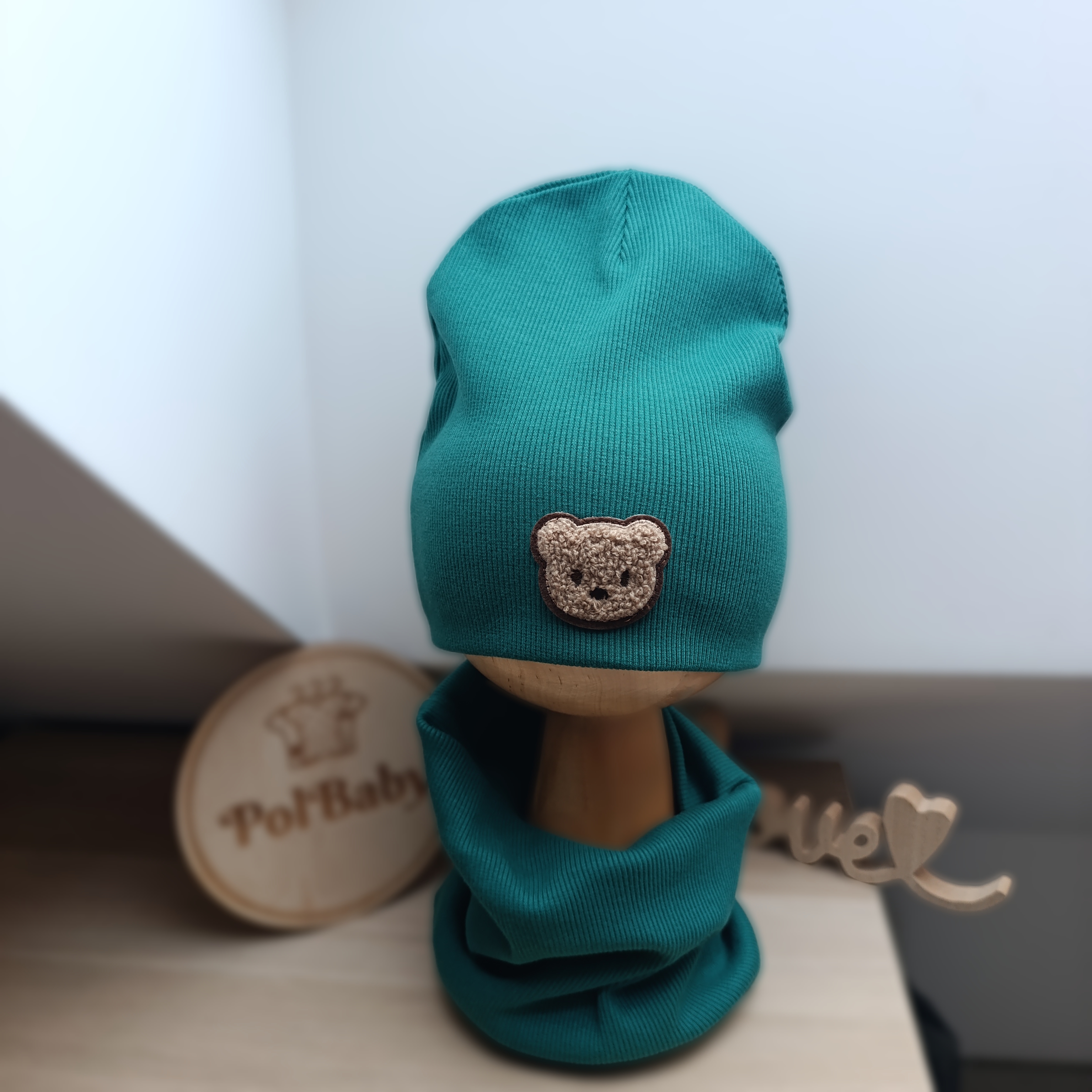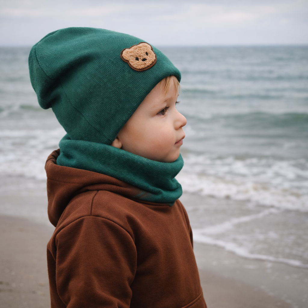 Komplet czapka i komin butelkowa zieleń z misiem